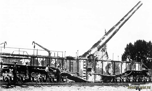В конце Первой мировой войны германская армия с успехом использовала 280-мм морские пушки, установленные на железнодорожных транспортерах.